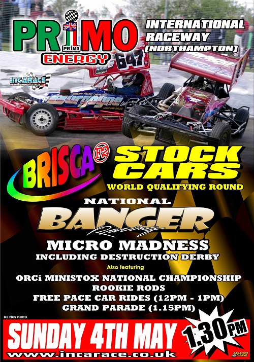 We look forward to seeing everyone at Pr1mo International Raceway, Northampton on Sunday 4th May when the Micro National Bangers, BriSCA F2 Stock Cars (World Qualifier), ORCi Mini Stox (National Championship) & Rookie Rods come to play!!
