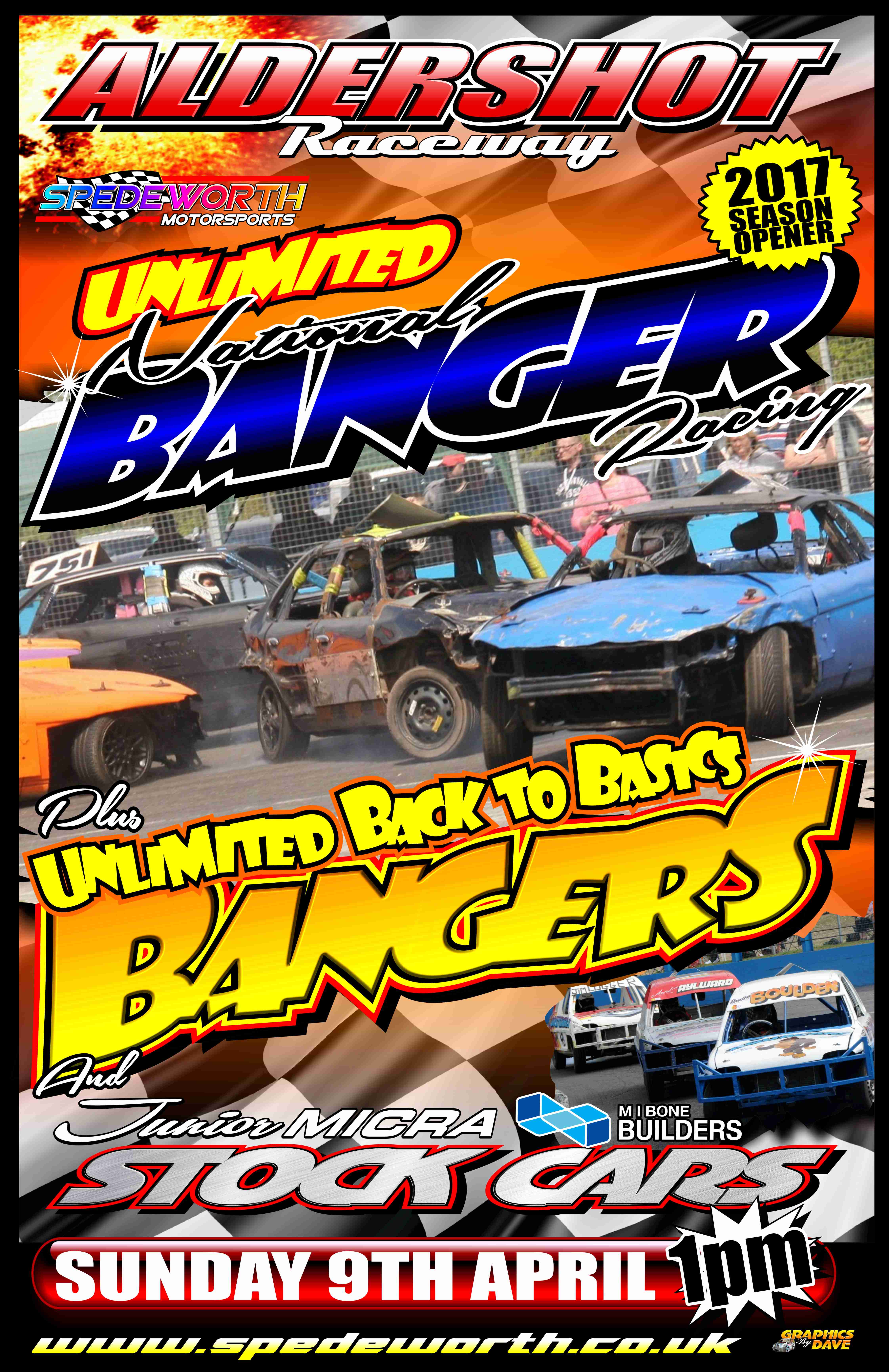 Finishing a busy weekend off we have another anticipated meeting as we open the doors at Aldershot Raceway for Season 2017 as we present Unlimited National Bangers, Bangers and the Bone Builders Junior Micra Stock Cars with the action getting underway at 1:00PM also.