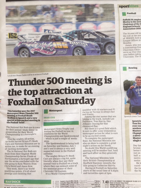 East Anglian Race Fans, don't forget to pick up your copy of the East Anglian Daily Times and Ipswich Star today for a Preview on this coming Saturday Nights fantastic Thunder 500 Meeting with 60 Brisca F1 Stock Cars, 27 National Hot Rods and 32 National Ministox at Foxhall Stadium, Ipswich.