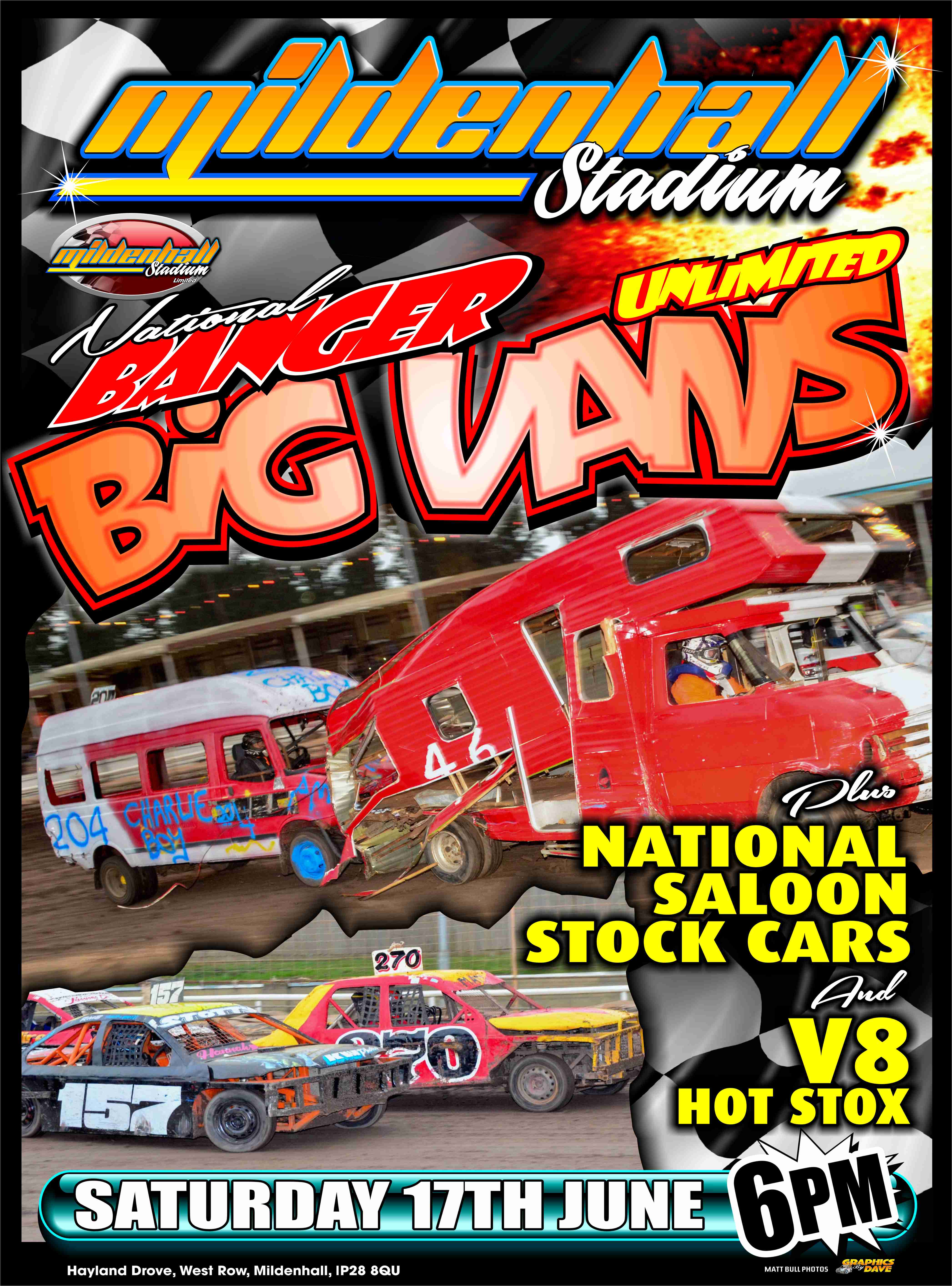 At Mildenhall we also have a terrific meeting in store with National Saloon Stock Cars, Unlimited Banger Vans and the superb V8 Hotstox for their annual visit to the West Row shale for a Traditional Stock Car night with the action underway at 6:30PM.