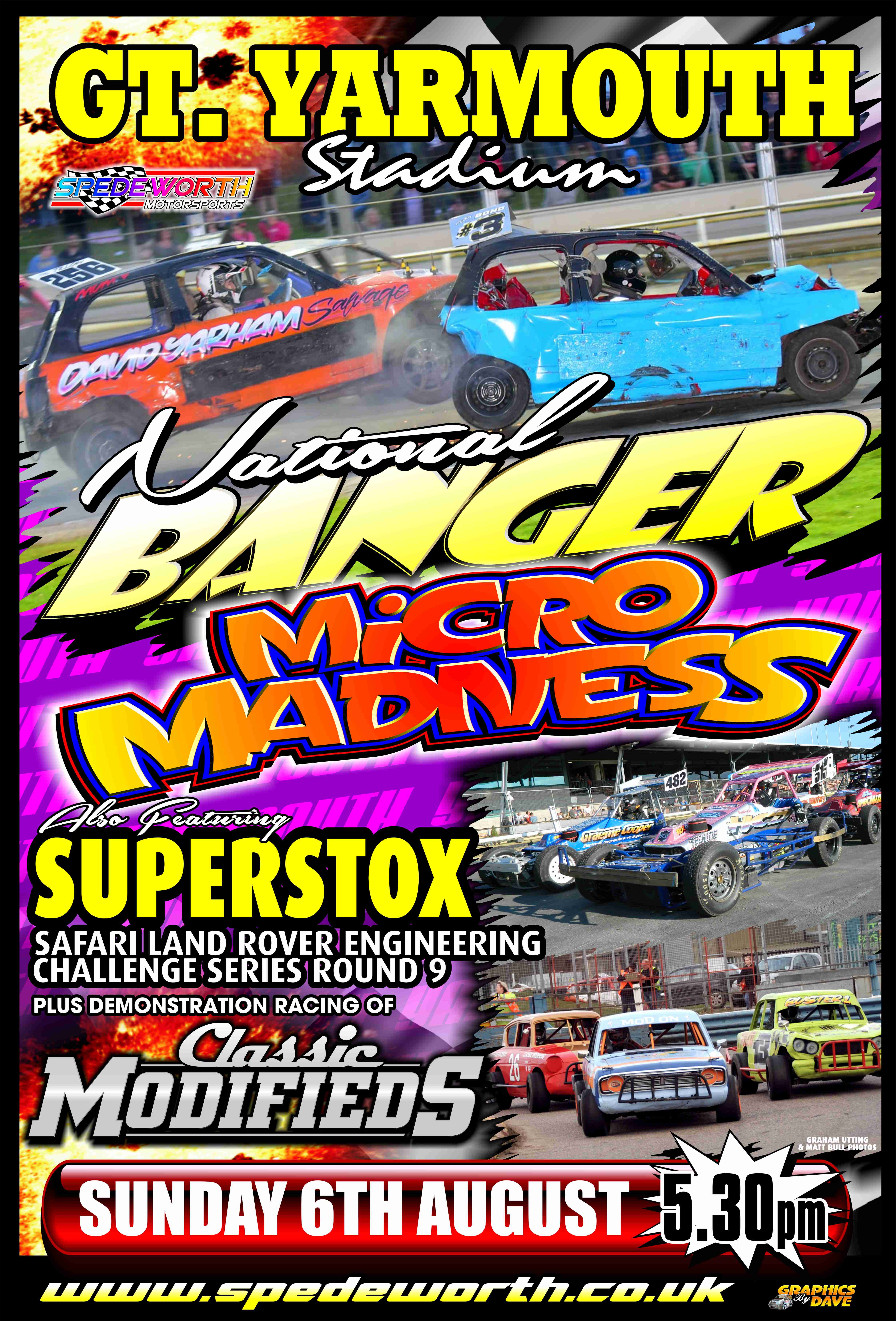 The weekend of action concludes at Gt Yarmouth Stadium featuring National Bangers, ‘Micro Madness’ the fantastic Superstox in the Safari Landrover Engineering Engineering Series Round 9 and the track debut of the Classic Modifieds with a start time of 5:30PM.
