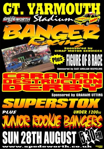 This coming Sunday at the Great Yarmouth Raceway see's the first ever Banger caravan race held at this venue with 17 drivers booked in thus far. There are also 3 other Banger races scheduled for the day including the 3rd round of the Figure of 8 Series sponsored by East Anglian Car Recycling. There are double points available for the Summer league series and additional prize money is up for grabs on the 2 oval races on the day and this will be split as follows:
