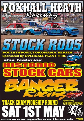 Stock Rods make up the non contact part of this three formula meeting as they race in a round of the Polleysport Yokohama Tyre series with sponsorship from Ovenden Plant Hire. The two big names in the south of England Andy Sturt and Stuart Smyth will be out to do battle, and often these tweo go away with the lions haul of the points. Coming down from Crewe in an attempt to stop them having it all their own way is World Champion Stuart Fox hoping for better luck than his last East Anglian trip when he clashed spectacularly with Mark Shinn at Great Yarmouth. A Bank Holiday weekend will often bring some of the longer distance travellers and this meeting will see four drivers making the journey south from Scotland. Stock Rods are a very strong class north of the border and Robert McDonald, Kerr Patterson, along with Jonathan and Tony Lattka will be welcome additions at the wide fast Foxhall oval. Local eyes will be on Shaun Taylor ant Steve Abbott who both race Vauxhall Novas, a car widely used in this formula due to its supply of parts and ease of maintenance. Woodbridge racer Paul Frost will be racing his Vauxhall Tigra which had its race debut at Yarmouth last month, while not a sparkling debut, Frost is well capable of sorting the new car and it wit will be interesting to see how it performs at Ipswich. We mentioned Simon Berry before when previewing the Bangers, well he is in for a busy night as he races his new Renault Clio Stock Rod as well as trying to hold on to his lead in the Ipswich Banger Championship.