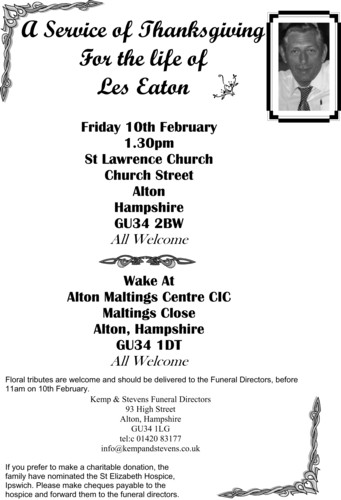 The following information may assist drivers, staff and supporters who are planning on attending the Service of Thanksgiving for Les Eaton on Friday 10th February.