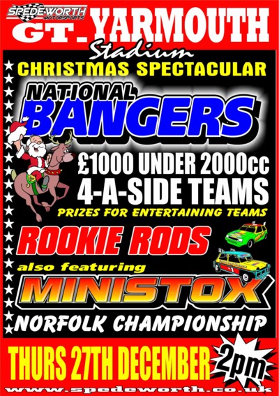 The scheduled Ministox Team racing event that was to take place at Yarmouth Stadium on Thursday 27th December has now been replaced by the Ministox Norfolk Championship. Bookings for this event can be made via the office on 01252 322920 or email to bookings@spedeworth.co.uk